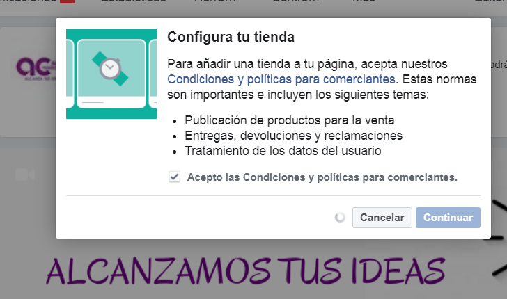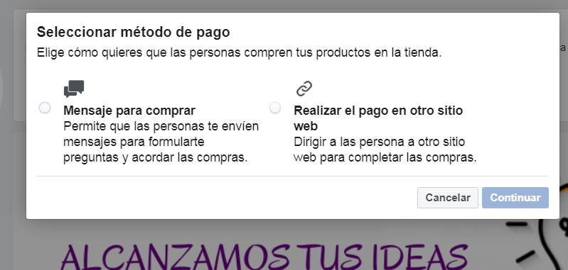 3. Selecciona el método de pago, lo recomendable es tener una página web con comercio electrónico para que a través de tu fanpage se direccione al cliente a completar la compra.