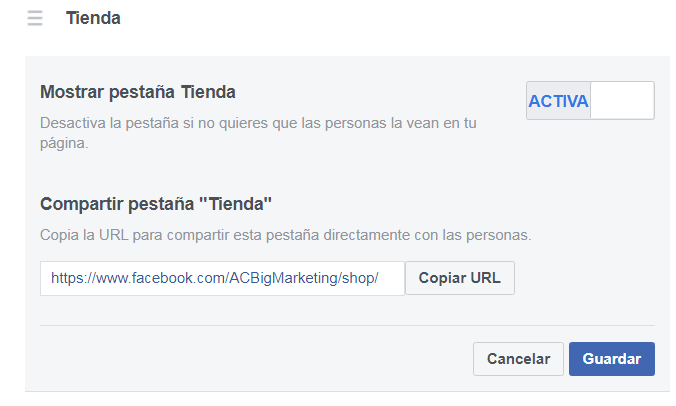 6. Finalmente si deseas promocionar tu tienda virtual de Facebook, por medio de chats en otras redes sociales puedes ir a la configuración, seleccionar plantillas y pestañas u copiar la URL